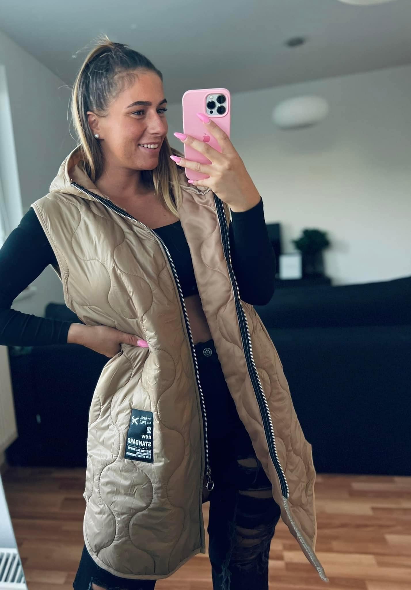 Moderní delší střih s kapucí, praktickým zipem a kapsami.